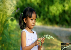 A girl holding a Moringa leaflet from the Philippines